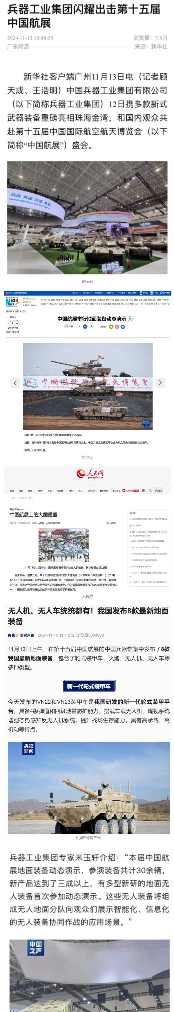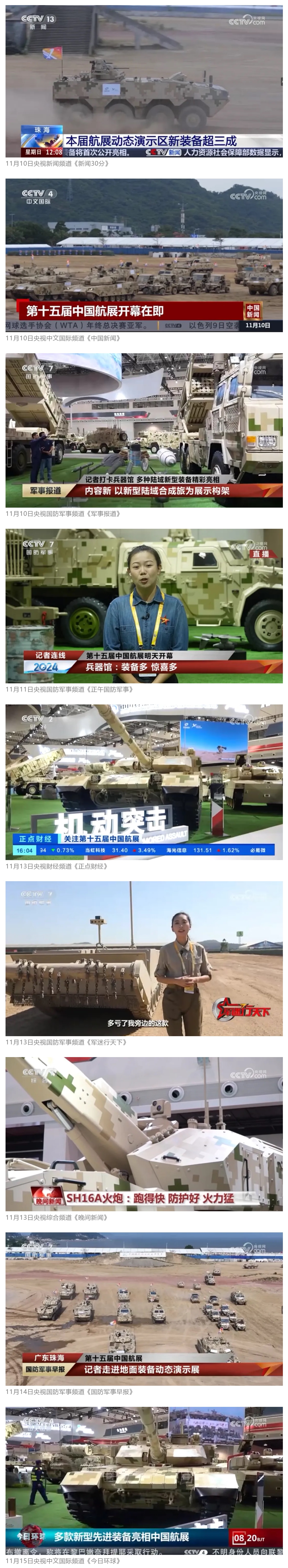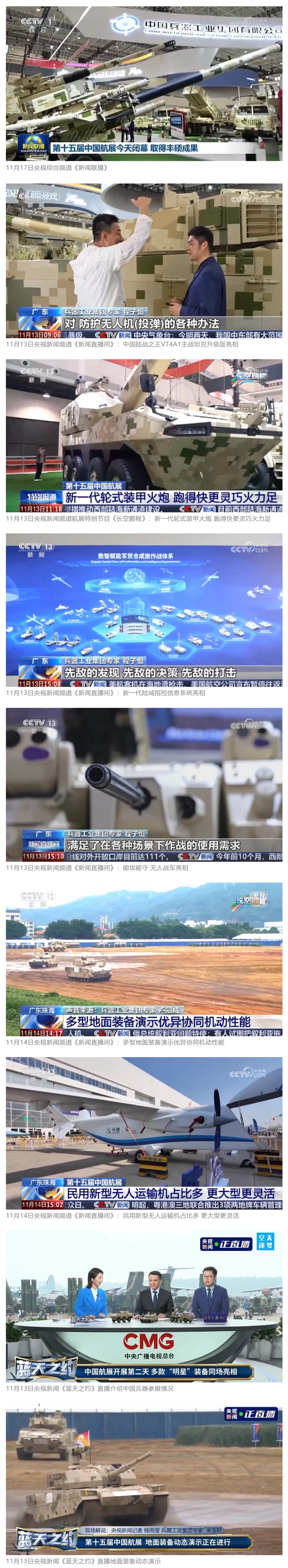 11月13日央視新聞《藍天之約》直播地面裝備動態演示此次航展,央視綜合頻道《新聞聯播》《晚間新聞》、新聞頻道《新聞直播間》《新聞30分》《朝聞天下》《共同關注》《東方時空》《午夜新聞》、財經頻道《天下財經》《經濟信息聯播》《正點財經》《第一時間》、中文國際頻道《今日環球》《中國新聞》、國防軍事頻道《軍事報道》《正午國防軍事》《國防軍事早報》《軍迷行天下》等欄目共播出兵器工業集團參展相關新聞報道40余條。11月10日央視新聞頻道《新聞30分》11月10日央視中文國際頻道《中國新聞》11月10日央視國防軍事頻道《軍事報道》11月11日央視國防軍事頻道《正午國防軍事》