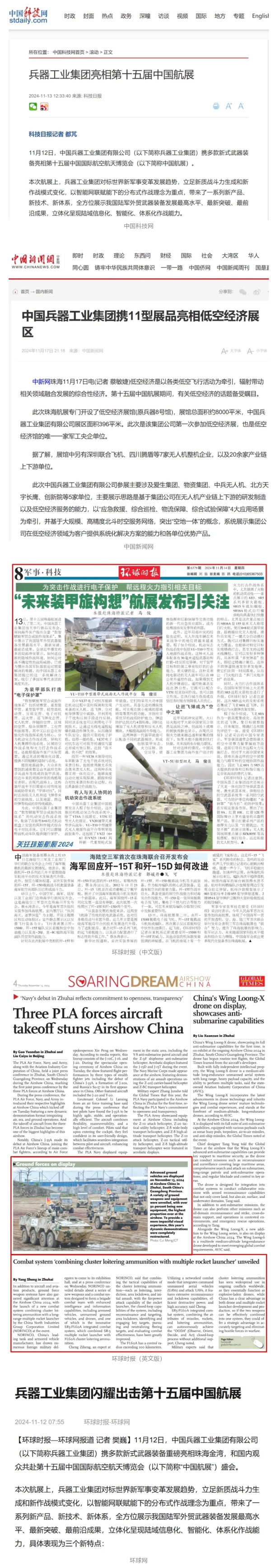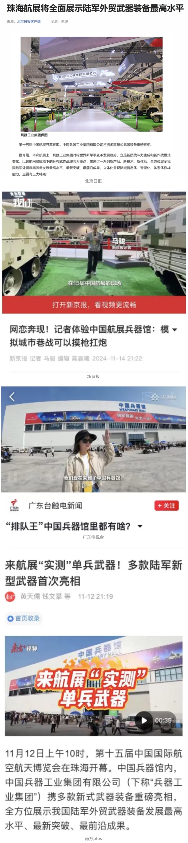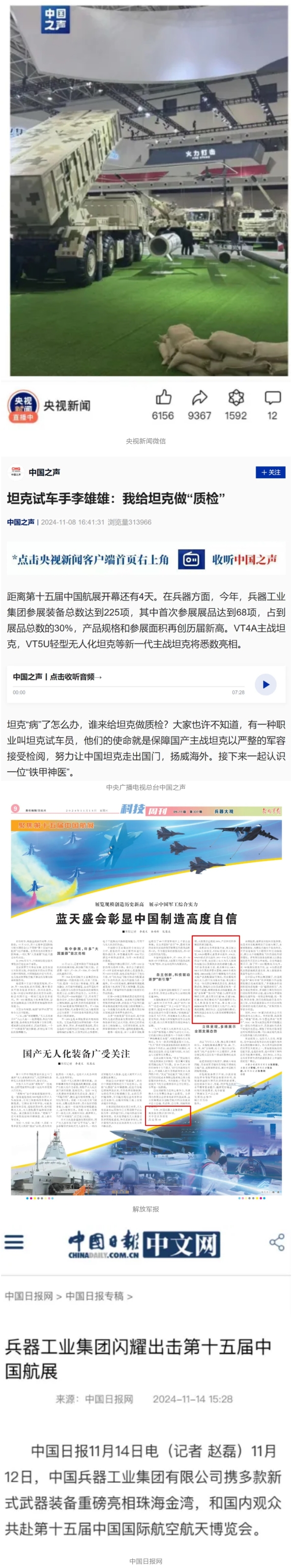 11月13日央視新聞《藍天之約》直播地面裝備動態演示此次航展,央視綜合頻道《新聞聯播》《晚間新聞》、新聞頻道《新聞直播間》《新聞30分》《朝聞天下》《共同關注》《東方時空》《午夜新聞》、財經頻道《天下財經》《經濟信息聯播》《正點財經》《第一時間》、中文國際頻道《今日環球》《中國新聞》、國防軍事頻道《軍事報道》《正午國防軍事》《國防軍事早報》《軍迷行天下》等欄目共播出兵器工業集團參展相關新聞報道40余條。11月10日央視新聞頻道《新聞30分》11月10日央視中文國際頻道《中國新聞》11月10日央視國防軍事頻道《軍事報道》11月11日央視國防軍事頻道《正午國防軍事》