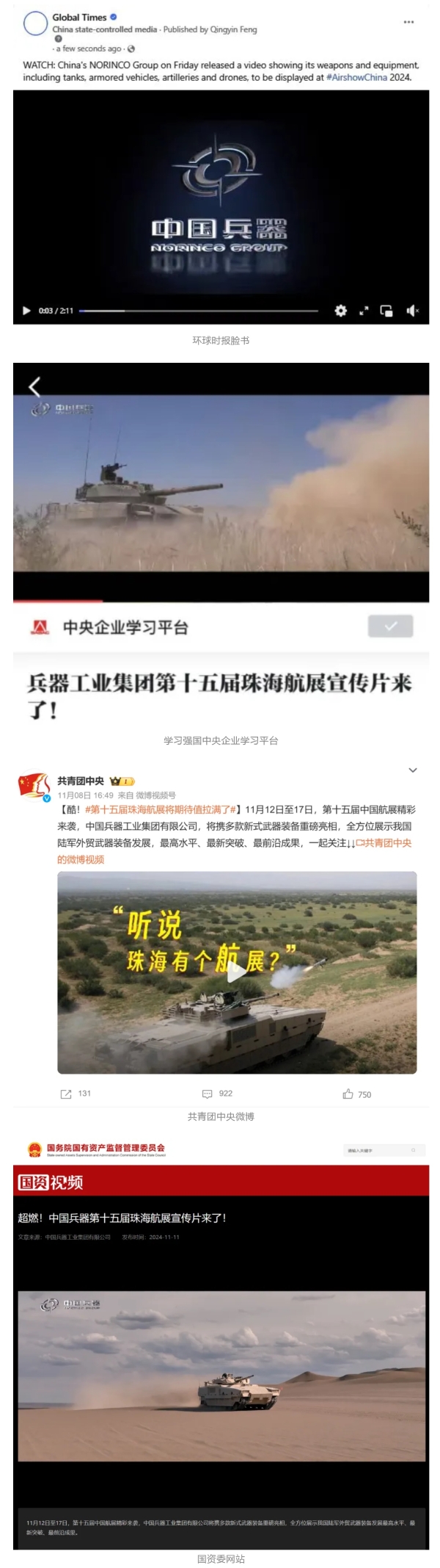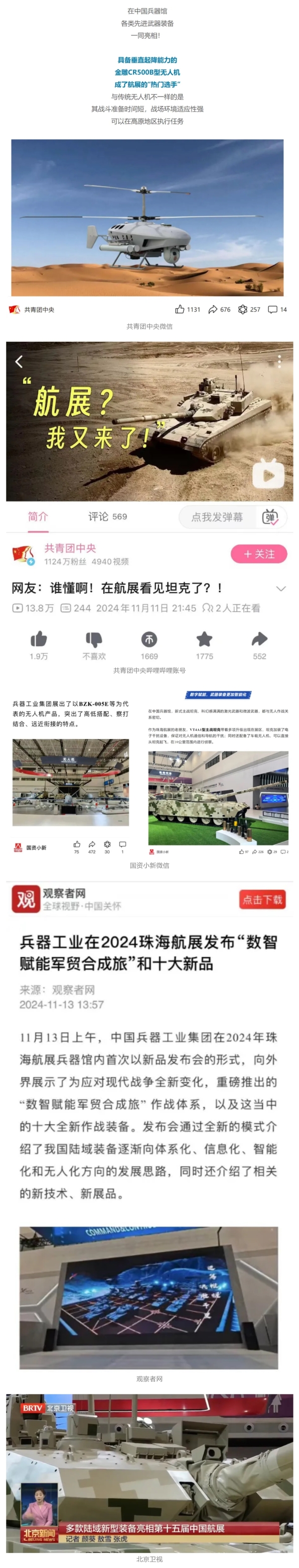 人民日報微博、新華社客戶端、央視軍事微博、中國軍號微博、央視軍事報道微博、中國日報微博、中國新聞網、中國青年報-青蜂俠、環球網、環球時報(臉書、X平臺)、學習強國中央企業學習平臺、共青團中央微博、國資委網站等20余家中央主流媒體、國家部委的新媒體第一時間播發集團公司航展宣傳片等視頻作品燃爆全網,累計閱讀量突破1200萬人次。集團公司微信公眾號、微博、抖音號、快手號、微信視頻號、知乎號等新媒體宣傳片播放閱讀量近1000萬人次,點贊近20萬人次。